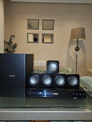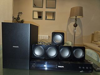 Se vende home cinema marca Philips. Consta de dos altavoces, un subwoofer y el reproductor. Puedes reproducir por varios métodos, cables, USB, o CD / DVD .