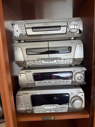 Equipo de sonido Technics en buen estado. Incluye cuatro componentes: sintonizador estéreo, amplificador de sonido, reproductor de casetes doble y cambiador de 5 CD. Disfruta de un sonido clásico con este conjunto elegante y plateado. - Sintonizador estéreo con RDS. - Amplificador con control de graves y agudos. - Reproductor de casetes doble. - Cambiador de 5 CD con sistema anti-choque.