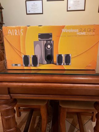 HOME CINEMA AIRIS 5,1 WIRELESS 2,4 GHZ, Altavoces Home Cinema 5,1 80W RMS. Características técnicas: Potencia total: 80W RMS a Ohms Satélites:10W RMS a 8 Ohms Subwoofer: 30W RMS a 8 Ohms Frecuencia: Wireless 2,4 GHZ Diemensiones: Subwoofer:170x300x290 mm Frontal y trasero:90x140x102 mm Central: 180x90x102 mm Nuevo, en su caja original, todo precintado en su embalaje original,con toda documentación, nunca se ha usado. Perfectamente conservado.