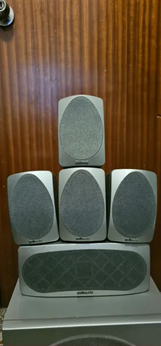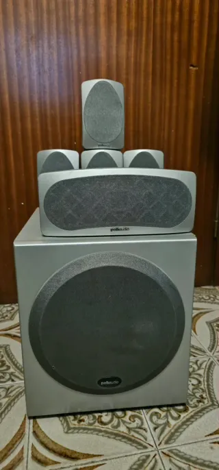 Equipo de audio para home cinema en perfecto estado. Incluye 5 altavoces y subwoofer. Los altavoces están impecables y el subwoofer funciona correctamente. - Sistema de sonido envolvente 5.1. - Altavoces y subwoofer en color gris. - Ideal para disfrutar de películas y música.