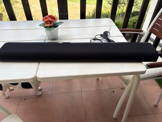 Barra de sonido Yamaha en perfecto estado. Es negra y tiene un diseño estilizado.