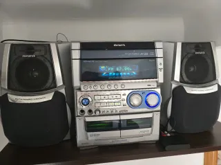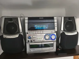 Equipo de sonido Aiwa con altavoces y subwoofer. - Sistema de audio digital. - Reproducción de CD-R/RW. - Radio FM. - Doble cassette con auto reverse. - Super T-Bass system. Incluyo un bluetooth para poder conectar cualquier dispositivo Algo negociable