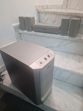 Sistema de cine en casa Airis de color gris plata. Está en buenas condiciones. - Incluye 3 altavoces y subwoofer. - Dispone de control de volumen y botones para subwoofer y altavoces traseros. - Conexión para DVD y CD.