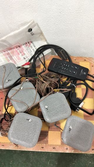 Se vende sistema de cine en casa LG de color gris. El conjunto incluye cinco altavoces compactos y un mando a distancia. Los altavoces tienen un diseño discreto y elegante. - Incluye 5 altavoces. - Mando a distancia incluido. - Cables de conexión incluidos.