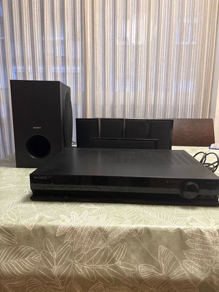 Sistema de cine en casa Sony con un diseño moderno y elegante. - Incluye dos altavoces frontales altos. - Subwoofer compacto. - Dos altavoces traseros. - Unidad principal de Blu-ray.tiene algun signos de uso pero se oye en perfecto estado
