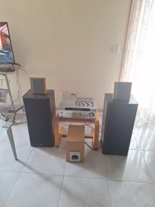Sistema de altavoces para cine en casa, en buen estado. Incluye cinco altavoces y un subwoofer. Los altavoces están montados sobre soportes metálicos. Perfectos para disfrutar de una experiencia de sonido envolvente.