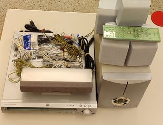 Sistema de cine en casa S-Master de color gris plata. Incluye un reproductor de DVD, subwoofer y 4 altavoces. El equipo está en buen estado, aunque presenta algunos signos de uso. - Sistema de sonido envolvente 5.1 - Incluye reproductor de DVD - Subwoofer y 4 altavoces