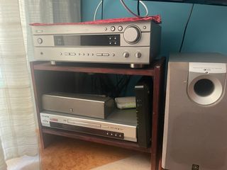 Receptor de audio y video de la marca Yamaha, en acabado gris plateado. - Diseño frontal con dial de volumen grande. - Pantalla digital naranja. - Conexión para auriculares en el frontal. El aparato de sonido funciona bien lo único que tiene es que cuando lo enciende a la mijita se apaga puede ser cualquier tontería un condensador o un fusible se vende también con un reproductor de audio FM aunque el Home Cinema lleva ya su radio FM incorporada pero como no lo estoy utilizando también lo vendo. Precio se puede negociar algo
