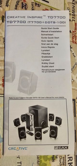 Sistema de cine en casa Creative Inspire TD7700 7.1 en buenas condiciones. Incluye todos los altavoces y subwoofer que se ven en la imagen. - Sistema de sonido envolvente 7.1. - Subwoofer incluido. - Control remoto incluido. - Altavoces en perfecto estado.