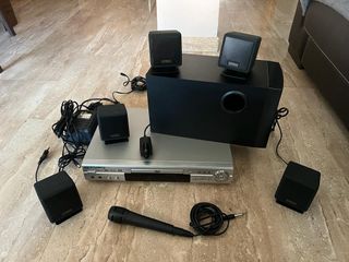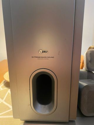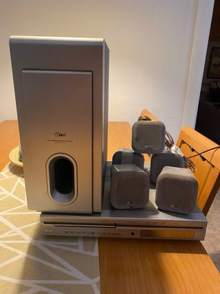 Sistema de cine en casa H&B con altavoces. - Subwoofer negro. - Cuatro altavoces satélite grises. - Incluye reproductor DVD y cable euroconector. Funciona perfectamente, lo único que tiene es que el botón de eject del DVD no funciona, pero el del mando si. Y la puerta del CD a veces hay que ayudarla con la mano.