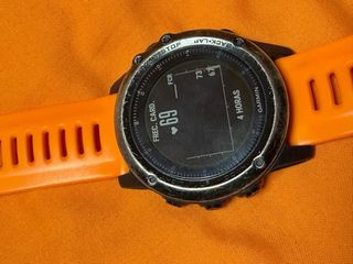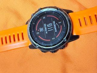 Reloj multideporte con correa naranja y detalles en negro. - Pantalla digital. - Bisel con marcas de orientación y altímetro/barómetro.