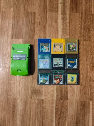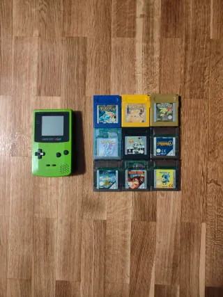 Consola portátil Game Boy Color en color verde, junto con una colección de nueve cartuchos de juegos para Game Boy.