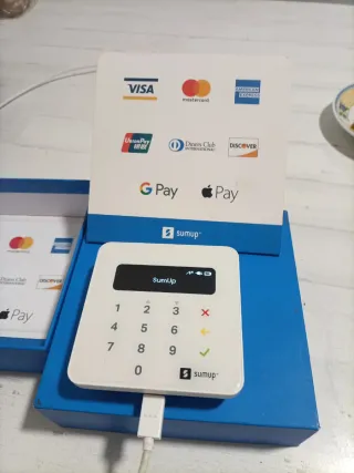 Lector de tarjetas SumUp para pagos. - Admite pagos con Visa, Mastercard, American Express, UnionPay, Diners Club e Discover. - Compatible con Google Pay y Apple Pay. - Pantalla con indicador de carga y señal.