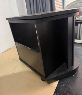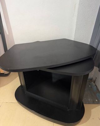 Mesa auxiliar negra con superficie giratoria. - Diseño moderno y funcional. - Compartimento de almacenamiento abierto.