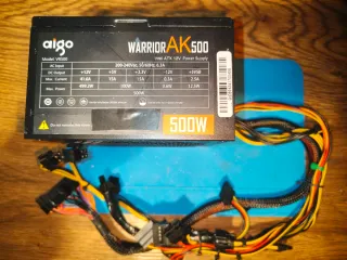 Fuente de alimentación para PC Aigo Warrior AK500. - Modelo: VR500 - Potencia: 500W - Voltaje de entrada: 200-240Vac - Corriente máxima: 41.6A (+12V) - Incluye cables de conexión.