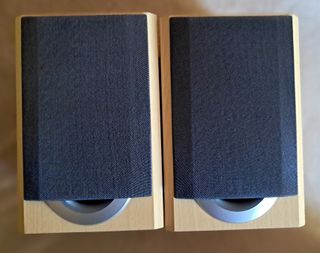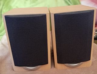 Pareja de Bafles SANYO con un diseño moderno y elegante. - 25 watios de potencia - Ancho: 14 cms. -Largo: 16 cms. -Alto: 20 cms. - Con conector en los cables - Acabado en madera clara. - Rejilla frontal de tela negra. - Base plateada. - Diseño compacto.