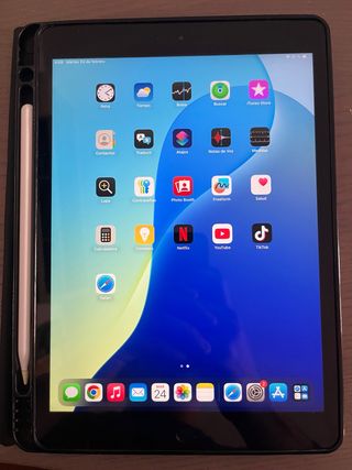 iPad de 6.ª generación . El iPad de 6.ª generación de Apple. Lanzado el 27 de marzo de 2018, con una pantalla de 9,7 pulgadas y 1536 x 2048 píxeles. Tiene una pequeña marca en una esquina q no influye en su funcionamiento Se incluye funda y meta pen