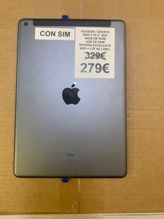 El precio mostrado es el de venta en nuestra tienda. El precio de este producto en nuestra página web puede ser diferente. Este artículo está disponible en nuestra tienda de Alacant. ipad apple ipad (wi-fi+5g) (a2757) (a2777) 64gb (10.2) (10 generacion) CC041_E714650_0 es un objeto que se ofrece en estado excelente. Todos nuestros productos cuentan con garantía de 3 años y un plazo de devolución de 14 días. Marca: Apple | Modelo: Ipad (wi-fi+5g) (a2757) (a2777) 64gb (10.2) (10 generacion) | Pulgadas: 10.2 | Capacidad: 64 | Bluetooth: Si | Gps: No | 3g: Wifi | Sistema operativo: Ios | Caja original: Si | Informacion adicional: