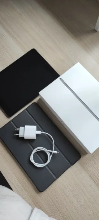 Tablet Apple iPad de 7ª generación con 32GB de almacenamiento comprada en 2020. Cargador y caja originales. El cable no es original. Incluyo funda protectora. La pantalla tiene un pequeño golpe abajo (foto) que no afecta a su funcionamiento. Tenía nombre y teléfono detrás y tuve que eliminarlos raspando. Por lo demás, está en muy buen estado.