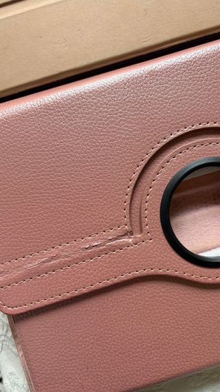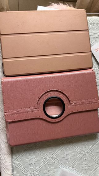 Se venden dos fundas para iPad, una en color rosa y otra en color beige. - Funda rosa con diseño de piel y aro central. - Funda beige tipo libro con pliegues.