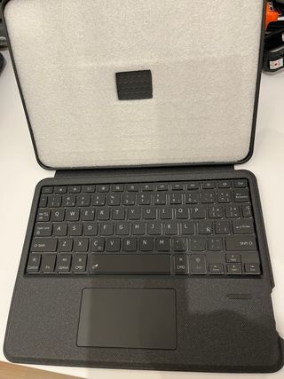 Funda con teclado en español para iPad Air 11”, conectividad vía bluetooth y batería alta capacidad incorporada. Coñor gris oscuro efecto textil. Está totalmente nuevo, sin estrenar, unicamente abierto para asegurarme de que era la versión para España (con su Ñ y su Ç). Muy funcional y versátil al poder separarse la carcasa trasera del frontal del teclado. Lo vendo porque justo me han regalado otro. - Hueco para el Apple Pencil. - Diseño elegante y compacto. - Incluye teclado retroiluminado medianre led multicolor. - Dispone de trackpad integrado. - Posibilidad de vincular teclado con varios dispositivos.