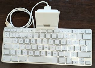 Teclado especial para iPad 1.ª, 2.ª y 3.ª generación, en español, también es base de carga, diseñado para mantener el dispositivo en un ángulo cómodo para escribir y cargar simultáneamente, cable incluido. - Conexión USB. - Diseño compacto y ligero.