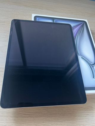 iPad Air de 13" con chip M2 y 128GB de almacenamiento, modelo Wi-Fi, color gris espacial. Muy poco uso, siempre en casa. Comprado en agosto de 2024. Se vende por no usar. Modelo de 13" (más grande que el de 11). Listo para usar. Se incluye: - iPad. - Caja original. - Cable de carga USB-C. - Funda (marca china, comprada en eBay) con hueco para Apple Pencil. - Soporte magnético de mesa marca Lululook rotable 90º (valorado en 70€). No incluye: - Cargador (los nuevos dispositivos de Apple no traen cargador. Vale cualquier cargador USB-C). Precio no negociable.