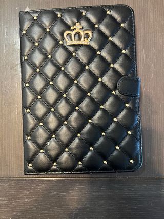 Funda para iPad Mini con un diseño acolchado y elegante. - Color negro. - Acolchado tipo diamante. - Detalle de corona dorada con pedrería. - Cierre de botón a presión.