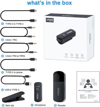 Sistema de micrófono inalámbrico portátil YMOO M5Pro. - Alcance de hasta 230 pies. - Incluye cable TYPE-C a TYPE-C. - Incluye cable 3.5mm TRS. - Incluye cable 3.5mm TRS a TRRS. - Incluye cable TYPE-C a iPhone. - Incluye cable USB a TYPE-C. - Incluye clip trasero. - Incluye micrófono. - Incluye grabadora. YMOO M5Pro 230ft Micrófono inalámbrico Lavalier para iPhone iPad, micrófono de Solapa con reducción de Ruido y Receptor para Tableta/teléfono/PC Grabación de Video, reunión, Vlog, Tiktok, Youtube