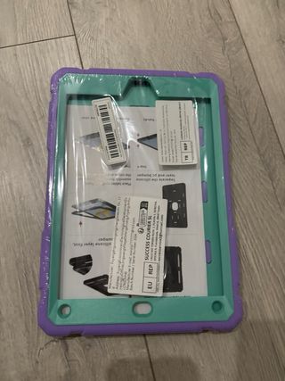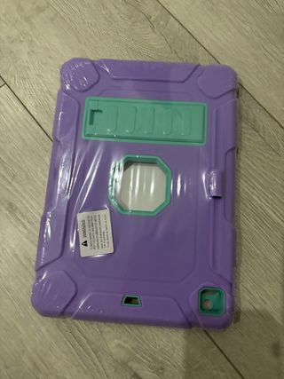 Funda protectora para iPad en color morado con detalles en verde menta. Diseñada para ofrecer seguridad y un agarre firme. - Material resistente. - Diseño con esquinas reforzadas. - Soporte integrado en la parte trasera.