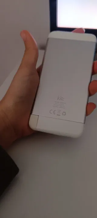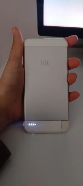 Esto es una batería portátil plateada de la marca Kit. Capacidad de 4,100 mAh. Certificación MFi (Made for iPhone/iPad/iPod). Diseño compacto y elegante.