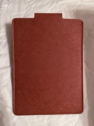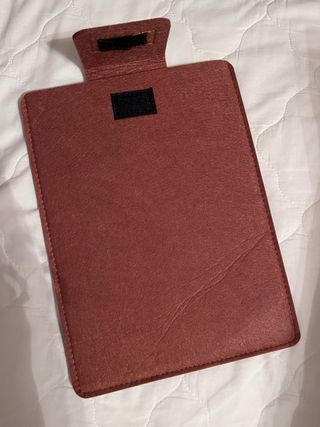 Funda protectora de fieltro en color marrón sin usar. Ideal para tablets o iPads con máximo 19x27cm. - Material de fieltro suave. - Cierre con velcro. - Diseño elegante y minimalista.