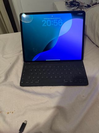 Tablet iPad Pro en color gris La bateria dura aproximadamente 5 h tiene un golpe en la pantalla que se fe en la foto La capacidad es de 512 g Viene con su teclado original en buenas condiciones