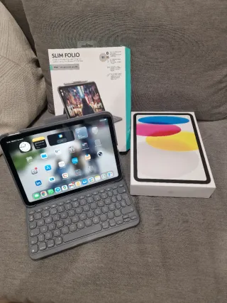 Se vende iPad 10 con funda teclado Logitech Slim Folio. - Capacidad de 64GB. - Conectividad WiFi. - Color plateado. En perfecto estado la batería casi nueva muy poco uso, la funda pasaría por nueva, esta actualizado a última versión, es solo WIFI. Con cristal protector desde el primer día, lo vendo por que me he cambiado de tablet a una Android por temas de trabajo. No marear por favor esta todo en la descripción, como se ve la última carga es de enero y aun está al 93% en estado de suspensión desde esa fecha. Valoraro ofertas razonables de cambios. Esta con todas sus cajas y papeles, he sido único propietario. #iphone #app