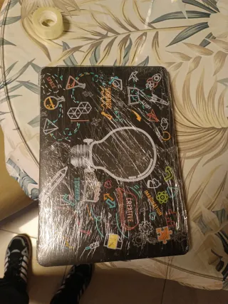 Funda protectora con un diseño original y llamativo, ideal para tu MacBook o iPad. Está envuelta en plástico protector. - Diseño con motivos de ciencia, creatividad e imaginación. - Estampado en negro con ilustraciones en varios colores.