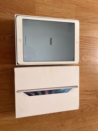 iPad Air 1 color blanco y plata de 32GB de almacenamiento y conexión WiFi,en perfecto estado literalmente,ni una marca,como nuevo. Reseteado y con la batería con buena autonomía. Incluye caja,cable de carga y adaptador de corriente original. Cristal protector desde inicio hasta ahora(última foto). Pantalla impecable y funcionamiento perfecto. Sistema operativo iOS 12.5.7 (última versión compatible). Ideal para navegación,lectura, audiolibros,email,facetime,Spotify,YouTube, Netflix,juegos y apps básicas. Comprado en 2015 y usado muy pocas veces. Grabado en la parte trasera “AYE”. Muy cuidado.