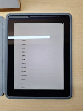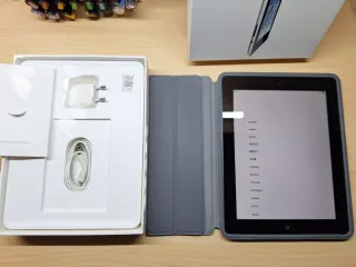 iPad de 4ª generación en color negro, modelo A1458, con 16GB de almacenamiento. Fue comprada en Japon. En la caja tiene una pegatina escrita en japones y trae un pequeño manual y papeles en japones ademas de las pegatinas de Apple. Se encuentra muy bien cuidada, la bateria dura varias horas de uso continuo viendo videos y en reposo más de una semana. Tiene la funda original de Apple para este modelo y casi nueva. El unico detalle es que en la pantalla que esta perfecta, hay unas rayas más finas que un cabello debido al uso o al limpiar la pantalla con microfibra quizás. No se aprecian a simple vista.
