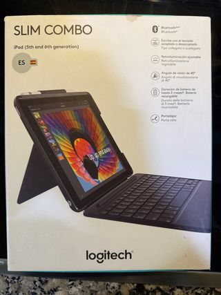 Funda con teclado Logitech Slim Combo para iPad de 5ª y 6ª generación. Permite escribir cómodamente y protege tu dispositivo. - Conexión Bluetooth. - Teclado acoplable o desacoplable. - Retroiluminación ajustable. - Ángulo de visión de 40°. - Duración de batería de hasta 3 meses. - Portalápiz integrado.