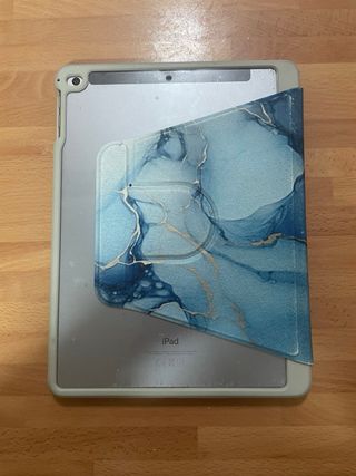 Funda protectora con un diseño de mármol en tonos azules y dorados. Se puede poner tanto en vertical como en horizontal. También lleva protector de pantalla. Esta en un estado muy bueno como se ve en las fotos, y funciona sin problemas. Lo vendo porque me he comprado otro mas grande