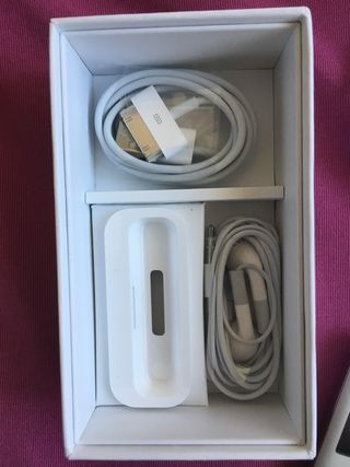 Ipod Nano de 4 GB. Está en buenas condiciones, con la caja y el cargador. Funciona perfectamente. Tiene unas marcas en la parte frontal inferior.
