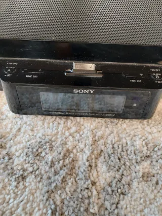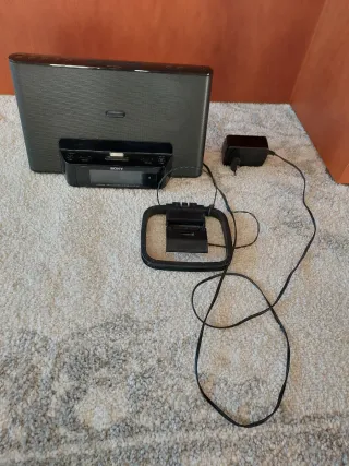 Radio despertador con diseño moderno y compacto. - Altavoz integrado. - Pantalla digital. - Botones de control en la parte superior. -tiene para connectar el ipod touch -RADIO, aux, Esta en perfecto estado