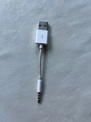 Cable blanco de 1.5 metros con conector USB en un extremo y jack de 3.5mm en el otro. Para cargar y transferir canciones a un iPod shuffle