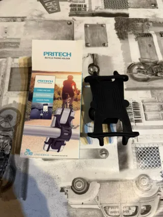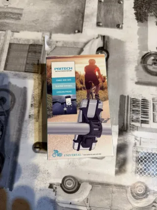 Soporte para móvil de la marca PRITECH, diseñado para bicicletas. - Material de silicona. - Estable y seguro. - Antivibración y anticaídas.