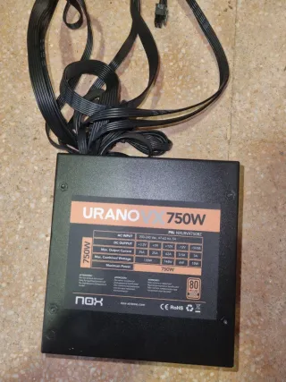 Fuente de alimentación NOX URANO VX de 750W con certificación 80 PLUS BRONZE. Ideal para tu equipo. - Potencia: 750W - Certificación: 80 PLUS BRONZE - Modelo: URANO VX - Voltaje AC: 200-240 Vac, 47-63 Hz, 5A - Salidas DC: +3.3V (25A), +5V (25A), +12V (62A), -12V (0.5A), +5VSB (3A) - Potencia combinada máxima: 750W