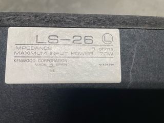Altavoces Kenwood modelo LS-26. - Impedancia: 8 ohmios. - Potencia máxima de entrada: 70W. - Fabricado por Kenwood Corporation. - Hecho en España.