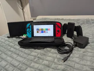 Consola Nintendo Switch con Joy-Cons en azul y rojo. - Incluye base de carga. - Incluye agarre para Joy-Cons. - Incluye funda protectora.