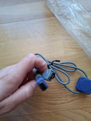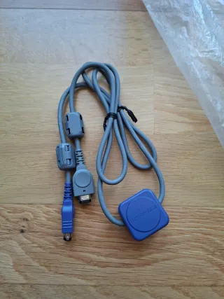Cable de conexión para Game Boy Advance. - Conecta dos consolas para jugar multijugador. - Cable de color gris con conectores azules y grises.