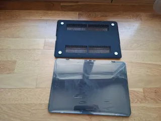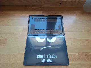 Funda protectora para portátil Mac con un diseño divertido y llamativo. - Diseño frontal con ojos y boca. - Texto DON'T TOUCH MY MAC en blanco. - Parte inferior negra con rejillas de ventilación. - Incluye las medidas para ver si corresponde con tu modelo de portátil.