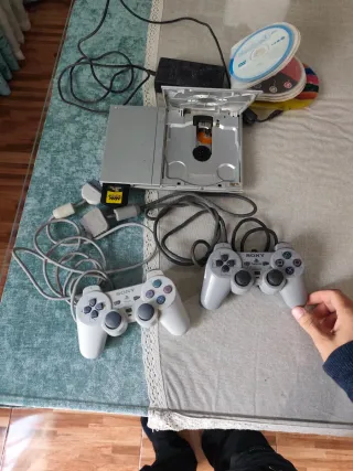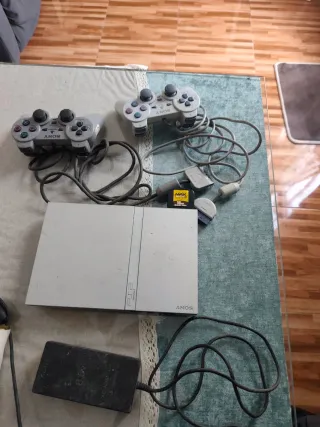 Consola PlayStation 2 Slim en color blanco, se dejó funcionando. - Incluye dos mandos. - Incluye memory card. - Incluye cables de conexión y adaptador de corriente.