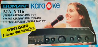 Sistema de karaoke completo marca BOMAN. Es amplificador y tiene varios tipos de entradas y salidas. El pack incluye: - x2 micrófonos marca BOMAN - Cables de conexión - x3 DVDs de karaoke (REGALO) Un solo uso. Fue un regalo no muy acertado. Ideal para reuniones entre amigos, eventos familiares y fiestas.